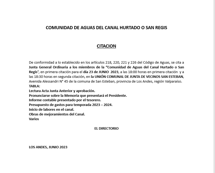 De conformidad a lo establecido en los artículos 218, 220, 221 y 226 del Código de Aguas, se cita a Junta General Ordinaria a los miembros de la “Comunidad de Aguas del Canal Hurtado o San Regis”, en primera citación para el día 23 de JUNIO 2023, a las 18:00 horas en primera citación y a las 18:30 horas en segunda citación, en la UNIÓN COMUNAL DE JUNTA DE VECINOS SAN ESTEBAN, Avenida Alessandri N° 45 de la comuna de San Esteban, provincia de Los Andes, región Valparaíso. TABLA: Lectura Acta Junta Anterior y aprobación. Pronunciarse sobre la Memoria que presentará el Presidente. Informe contable presentado por el tesorero. Presupuesto de gastos para temporada 2023 – 2024. Inicio de labores en el canal. Obras de mejoramientos del Canal. Varios EL DIRECTORIO LOS ANDES, JUNIO 2023