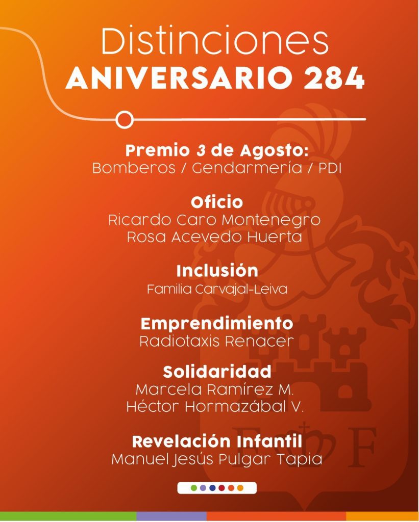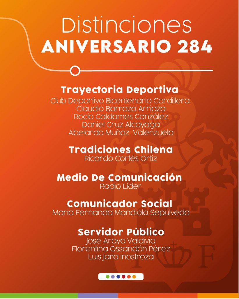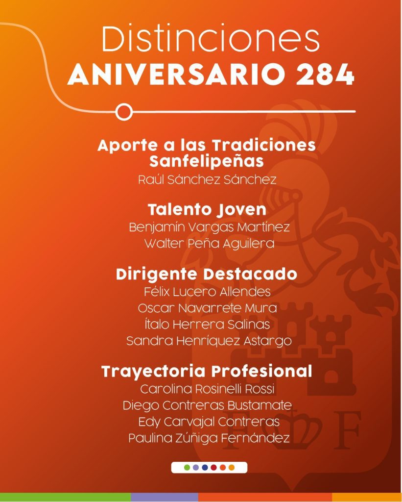 SAN FELIPE, En el marco de la celebración del 284 aniversario de San Felipe, la alcaldesa Carmen Castillo ha dado a conocer el listado de distinciones que serán entregadas este año en un acto solemne, continuando con una tradición que enaltece a destacados ciudadanos y figuras locales.